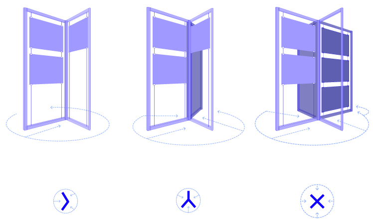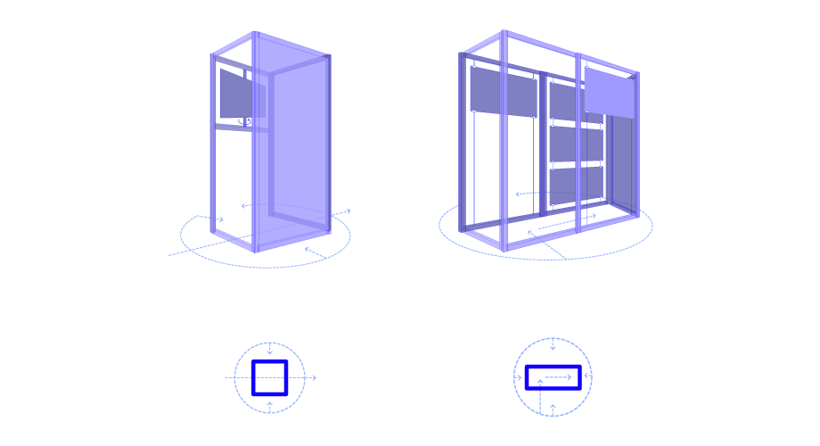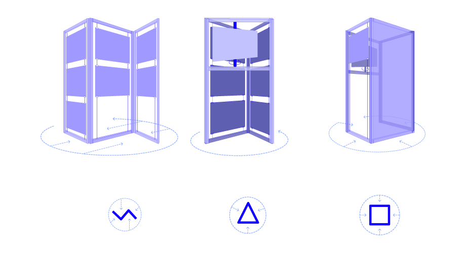 The modules can be assembled in various ways to be self-supporting and create sub-spaces within the exhibition. The empty frames make the exhibition visually lighter (as it will be displayed in high-traffic areas, offices) and give the images the spotlight.