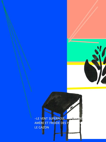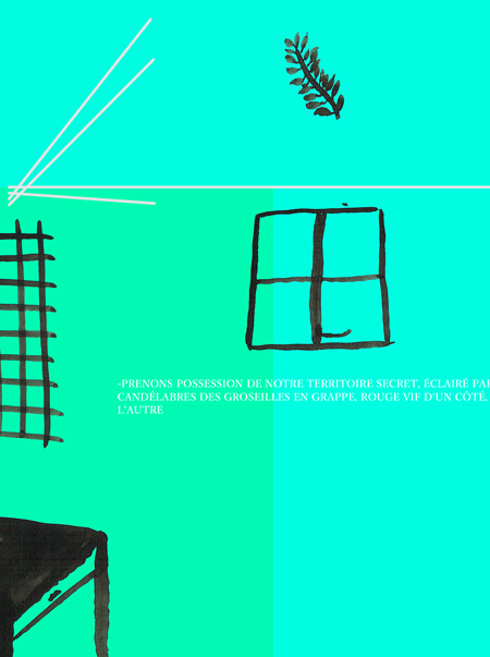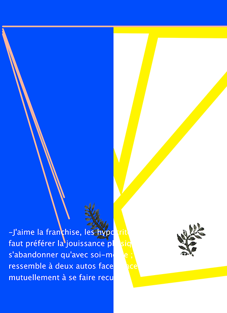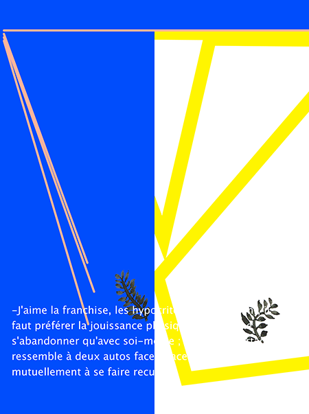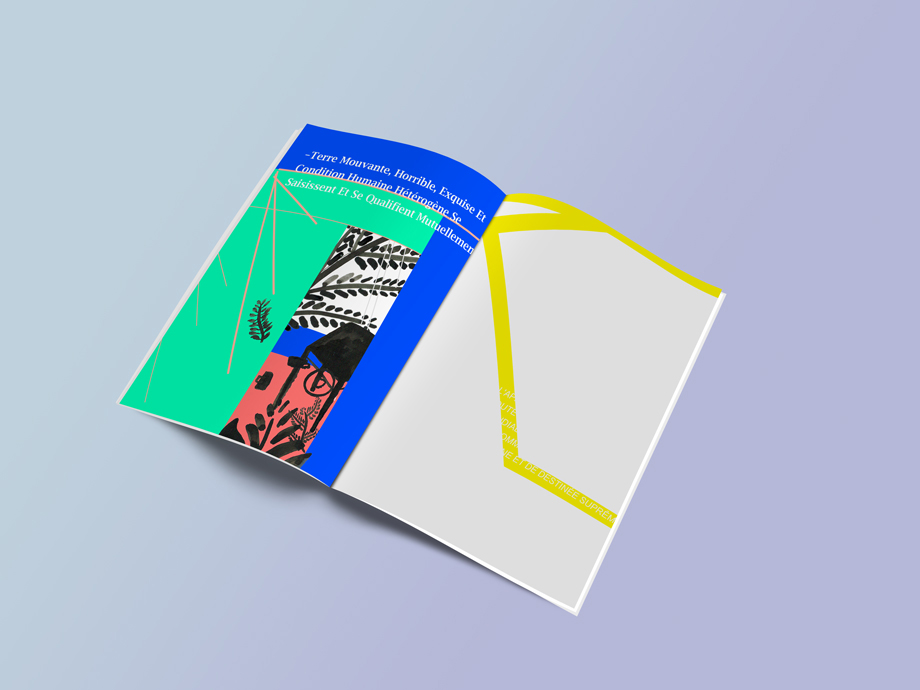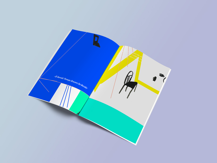 I coded a small program, based on the idea of a spatio-temporal crack, that randomly generates a fanzine. In order to use it, you have to to add a few sketches, to choose a palette of colors, and then to pick a small sentence, or just a few words, which will be the start of an absurd text. The images and colors are then randomly choosen and disposed on the page. The sentences have been randomly picked on WikiQuote, but the last word of the sentence A is the first word of the sentence B, so it gives a continuity to the narrative. The code creates visual and textual stories with a crack, the shift of the story. It corresponds to a restart of the code, so the colors are different, as well as the composition. I consider it as an inspirative tool to create new visual compositions from sketches and a few words. It is a way to open up a project thanks to unexpected results, and to link different stories or visual universes.