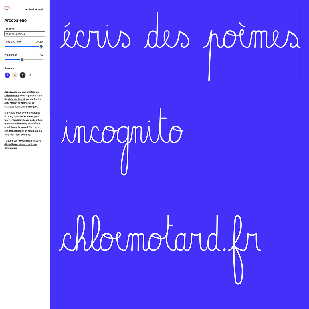 Arcobaleno est une smart-typographie cursive, créée en collaboration avec Olivier Hecquet et le Centre Asty-Moulin : une école belge qui accueille chaque année des enfants et adolescents faisant leurs premières années dans une école francophone.