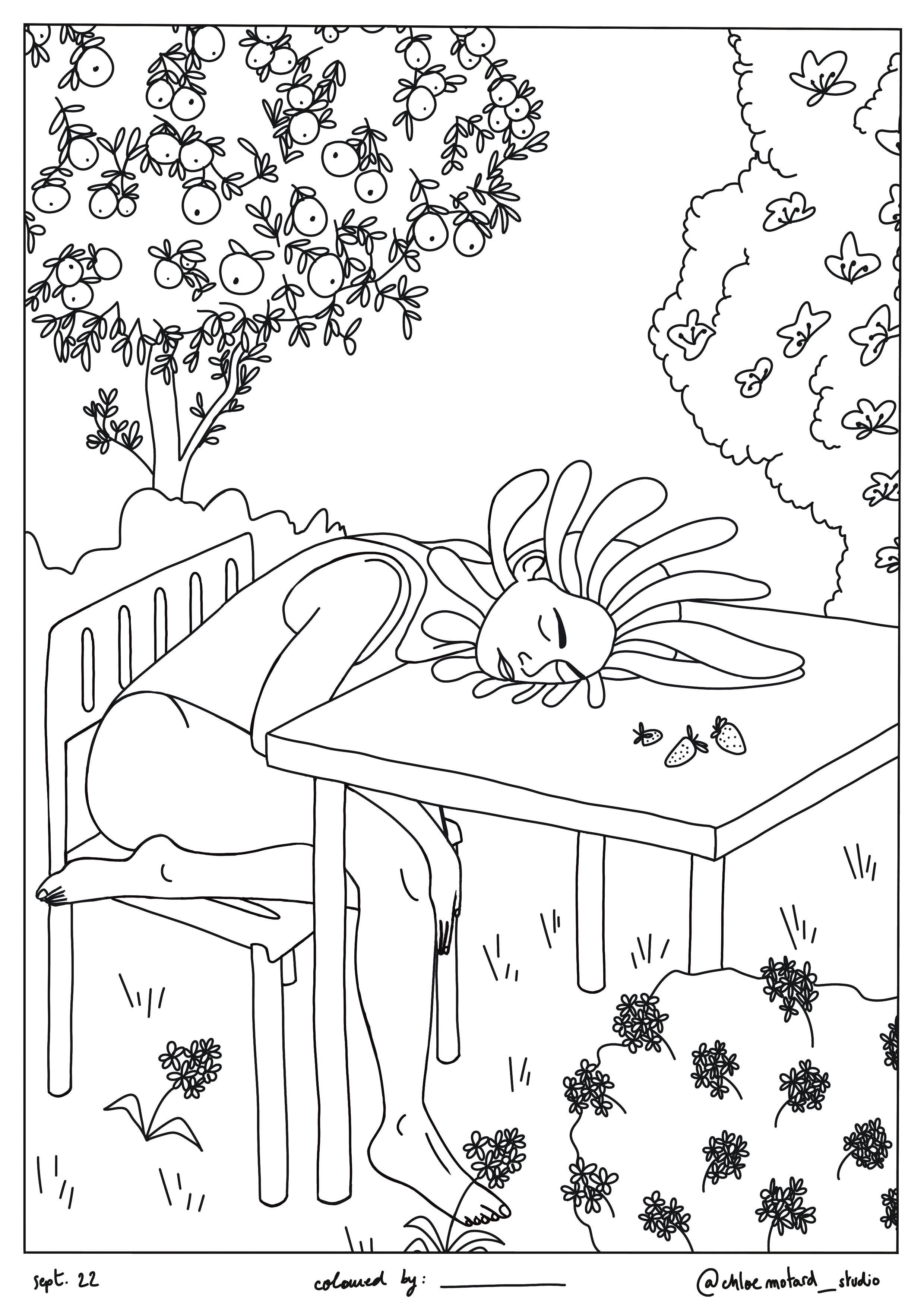 This month’s coloriage Sieste au jardin (a nap in the garden)