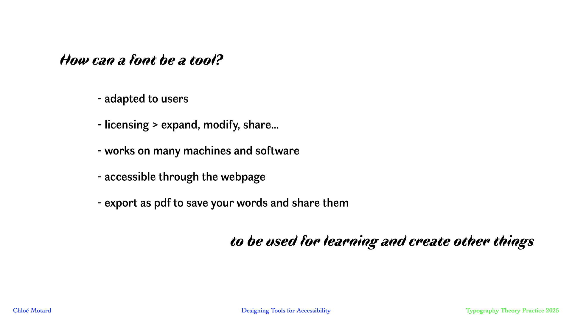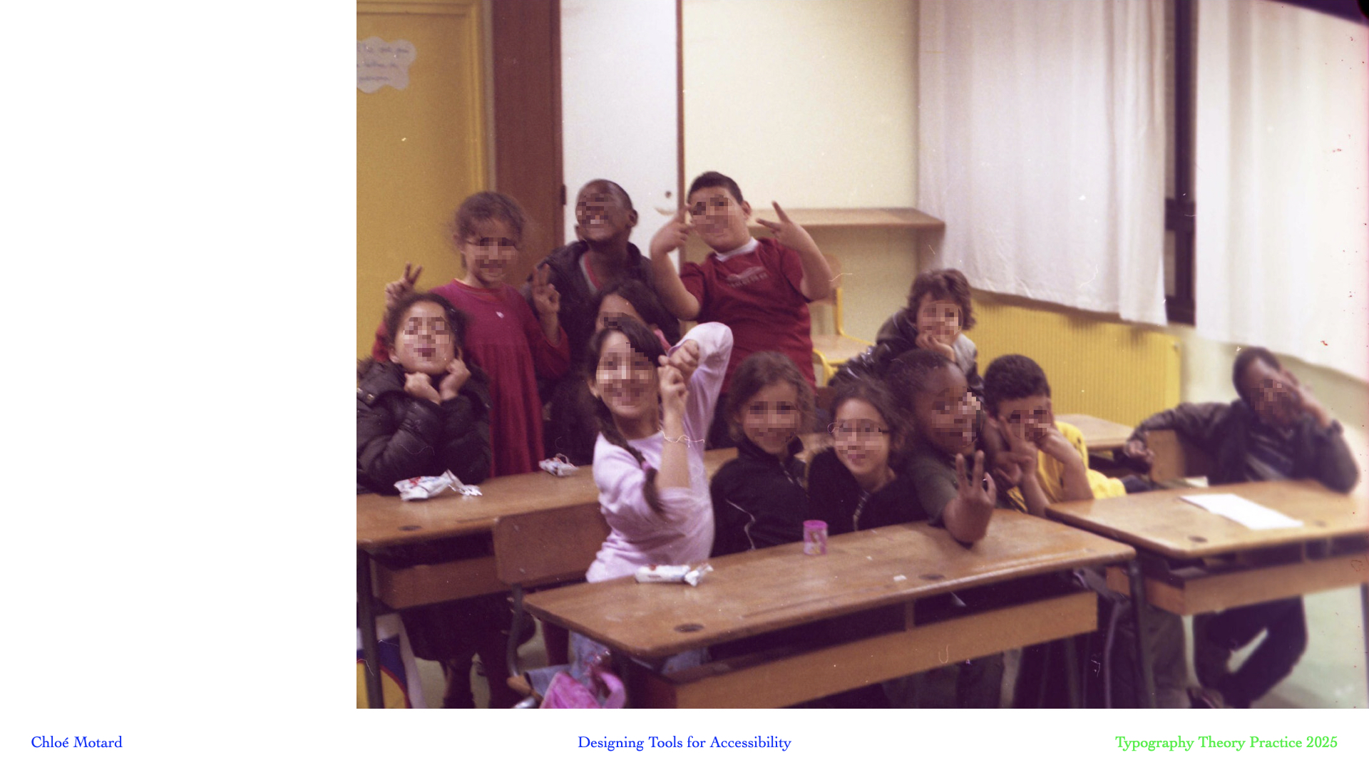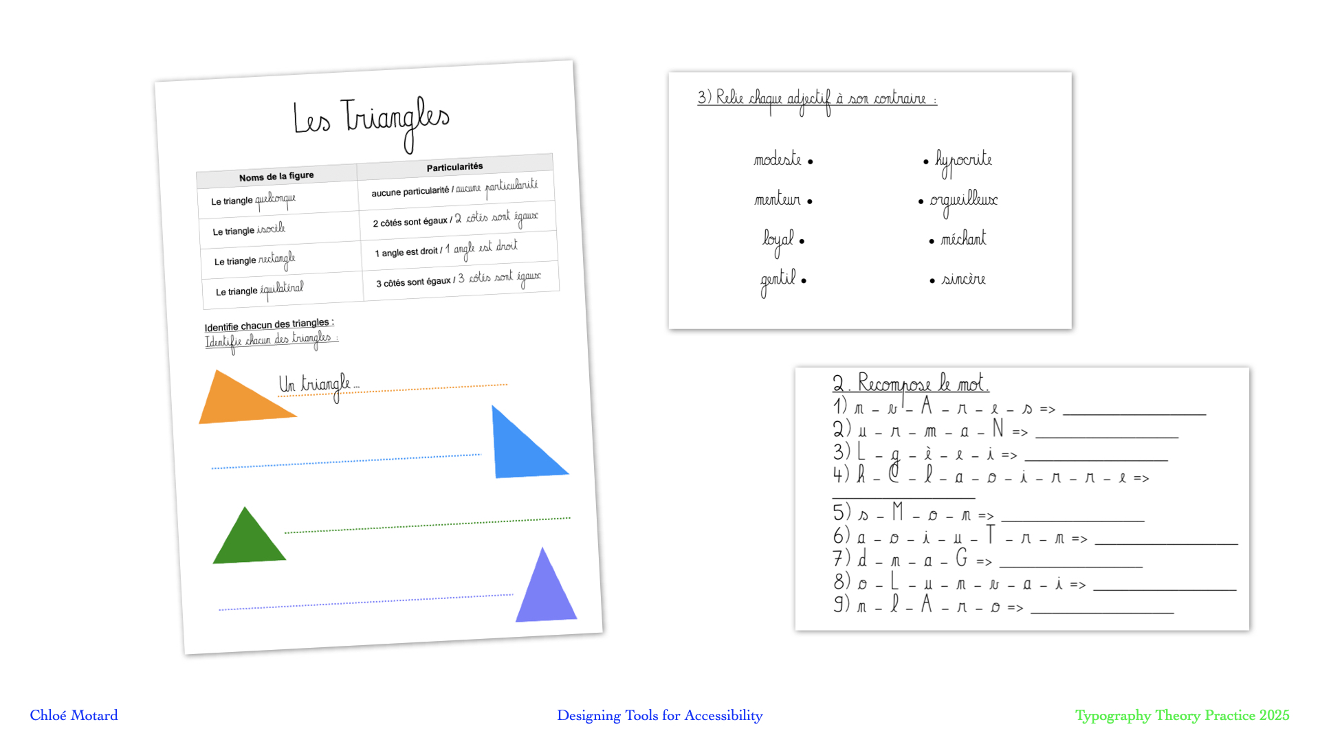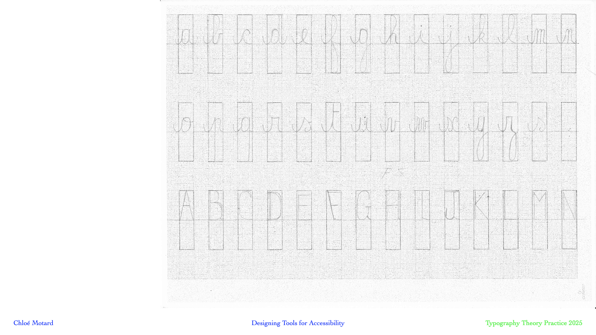 Understanding the typography as a tool for accessibility rather than a typeface early on in the process really put first its future context of use : in the classroom by teachers but first of all by its readers : the students, children and teens, who are learning to make sense of all these loops and bridges. This project demonstrates the relevance of approaching a very specific social issue with the methodology and toolbox of design.- created for: