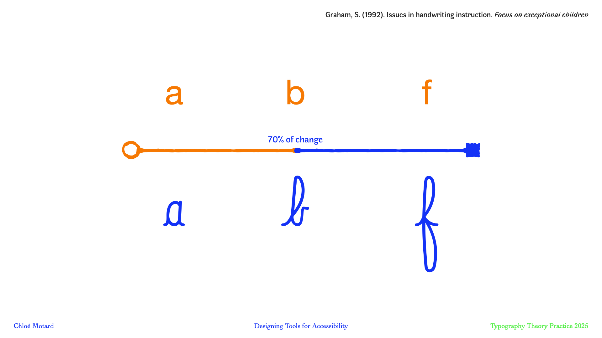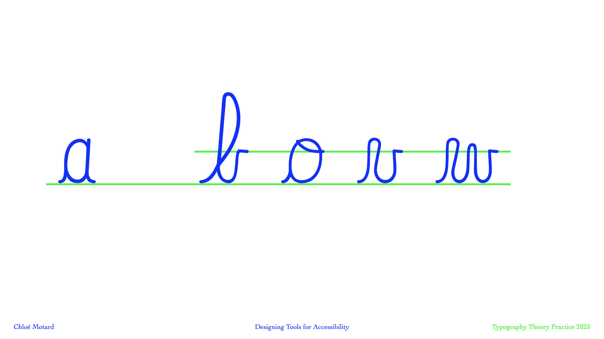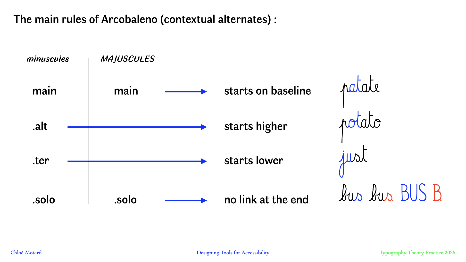 In this talk I will walk you through my design process (methodology, tools and tests) as I developed Arcobaleno, in collaboration with the Belgian teacher of French for non-native speakers and author of teaching methods Olivier Hecquet, to develop a cursive typography that addresses these specific challenges.