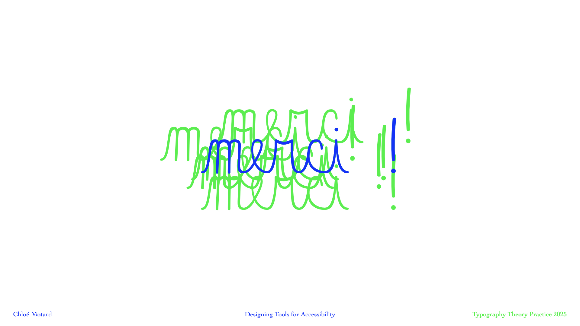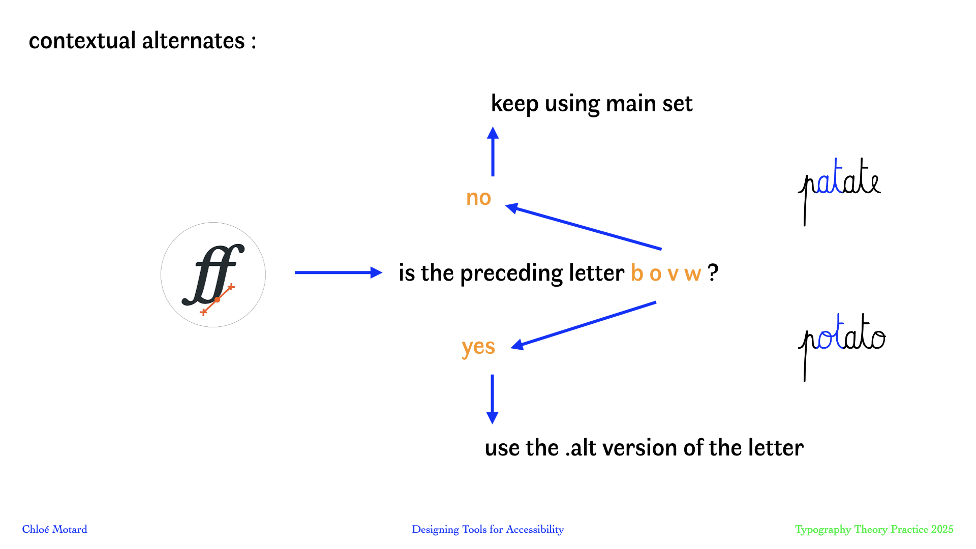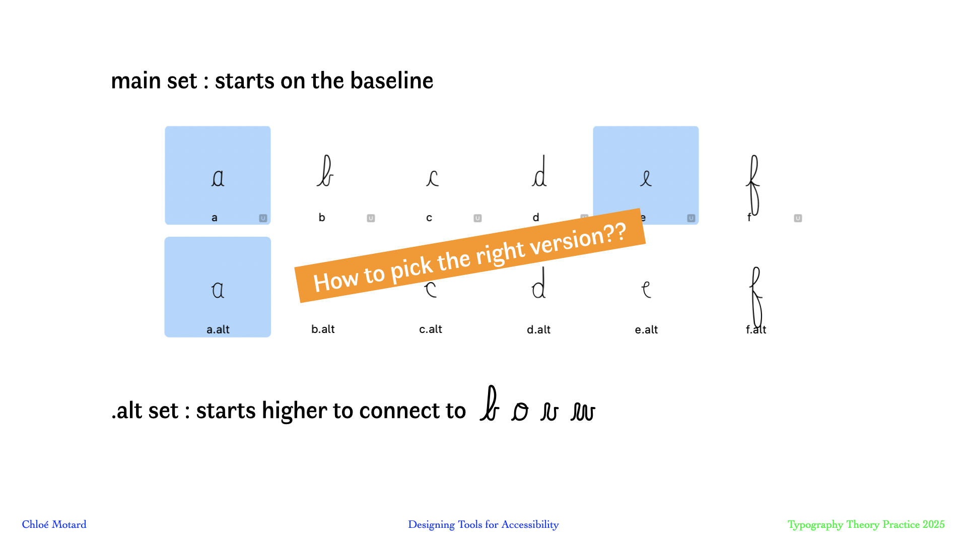 In this talk I will walk you through my design process (methodology, tools and tests) as I developed Arcobaleno, in collaboration with the Belgian teacher of French for non-native speakers and author of teaching methods Olivier Hecquet, to develop a cursive typography that addresses these specific challenges.